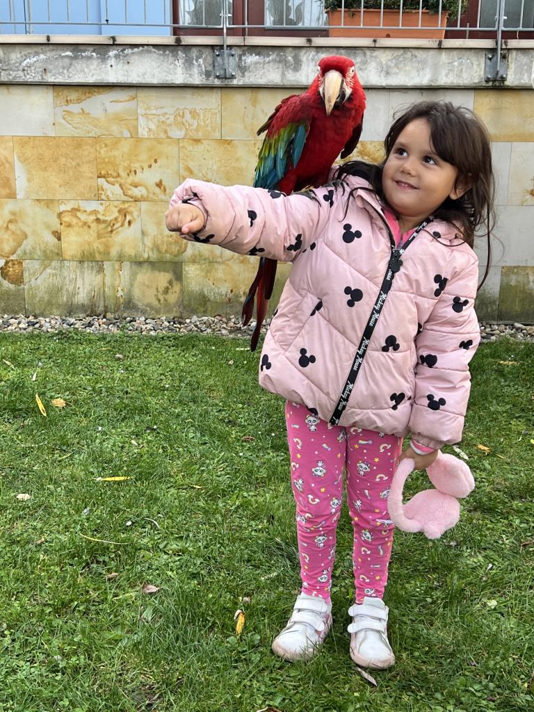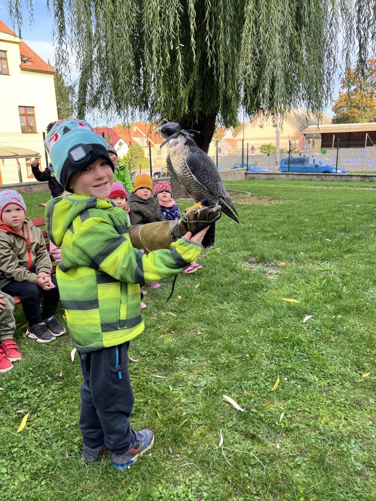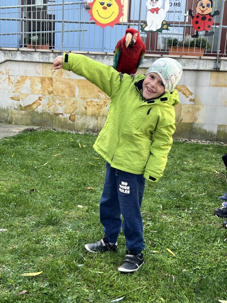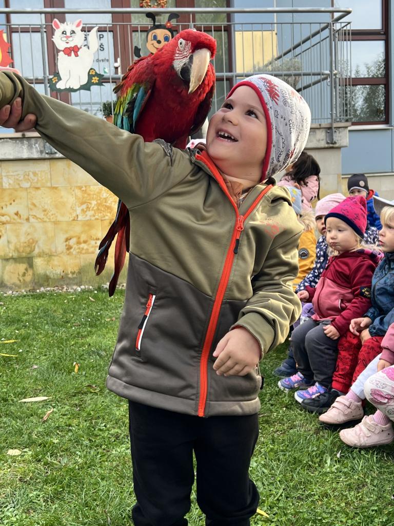 Dnes nás navštívili dravci. Dětem se nejvíce líbila barevná Ara, která si dětem sedala na ramena. Dnešní den byl velkým zážitkem, nejen pro děti.