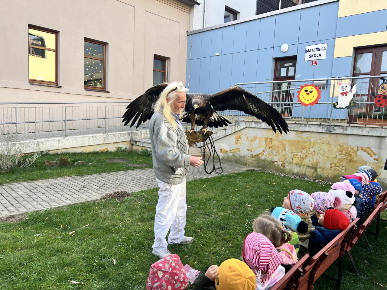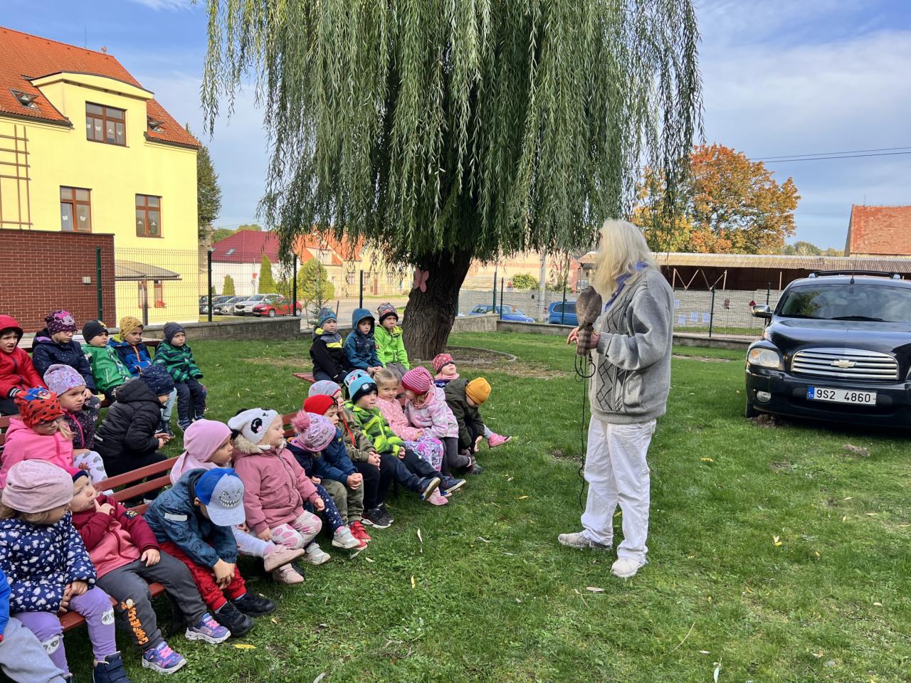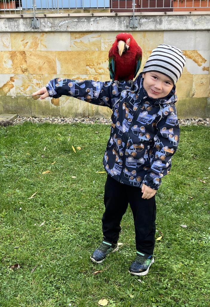 Dnes nás navštívili dravci. Dětem se nejvíce líbila barevná Ara, která si dětem sedala na ramena. Dnešní den byl velkým zážitkem, nejen pro děti.