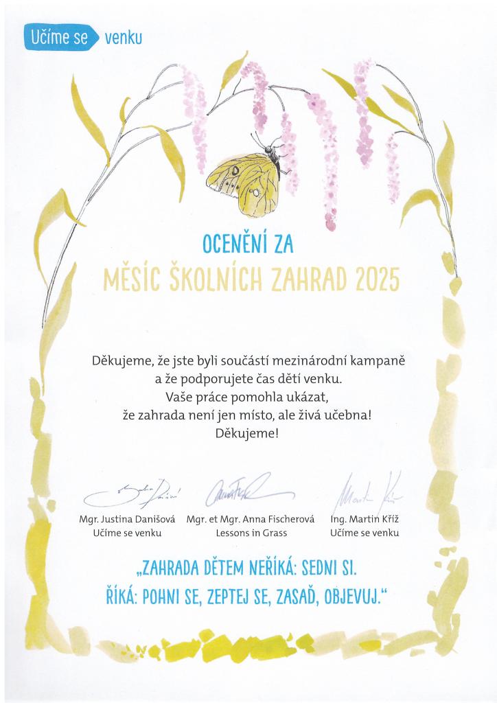 V rámci mezinárodní kampaně Měsíc školních zahrad 2025 bychom rádi poděkovali všem, kteří se zapojili a přispěli k podpoře dětí ve venkovních aktivitách. Vaše práce pomohla osvětlit důležitost školních zahrad jako živých učeben, které inspirují děti k objevování přírody. Zahrada není jen místem, ale prostorem pro učení a kreativitu, což se nám společně daří naplňovat.