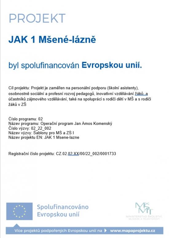 V letech 2022 – 2024 naše škola realizovala v rámci Operačního programu Jan Amos Komenský I, název výzvy: Šablony pro MŠ a ZŠ I, číslo výzvy: 02_22_002 projekt „JAK 1 Mšené-lázně“. Žádost jsme opět zvládli vypracovat sami, a tak škola získala celou dotaci ve výši 1 449 605,00 Kč na realizaci aktivit zaměřených na prohloubení dovedností žáků i učitelů a na rozšíření spolupráce s rodičovskou veřejností.