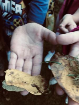 Poznáváme přírodní materiál a hledáme to v přírodě: něco hnědého, něco tvrdého, něco ohebného, něco barevného,... Taky něco, co někdo někde zapomněl a do přírody nepatří.
