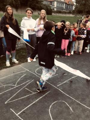 Hadí tělocvik, kdy jsme dělali hada až na Vrbici. Cestou jsme se protahovali, skákali a hráli hadí hry.