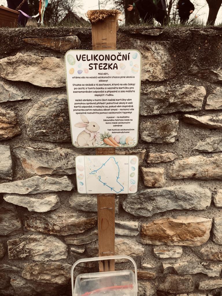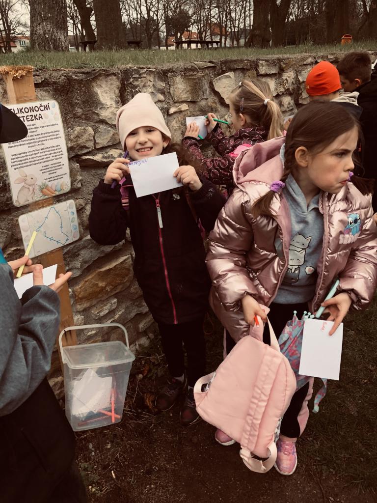 Děti si prošly stezku s poznáváním jarních tradic. Velikonoce jsou tradice, které oslavujeme každý rok po prvním jarním úplňku. Tak jsme se vydali na stezku a kartičky nás zavedly až k pokladu.