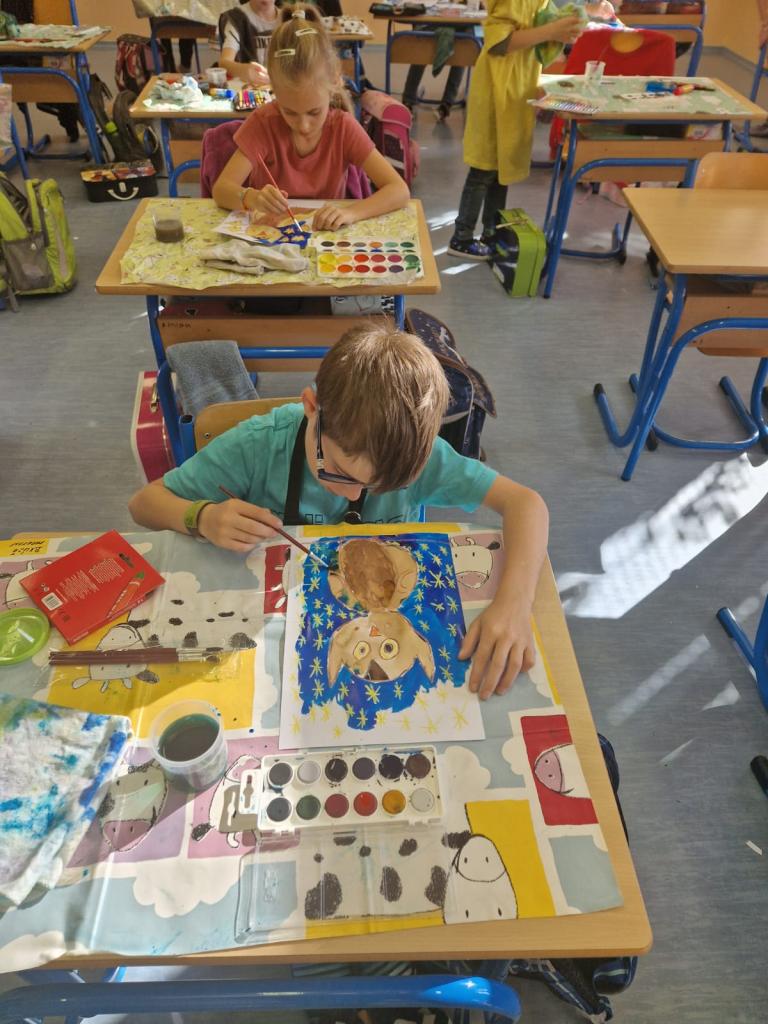 Druháčci během výtvarné výchovy tvořili krásné obrázky na téma "sova" . Všem se to moc povedlo a tak máme novou výzdobu do třídy.