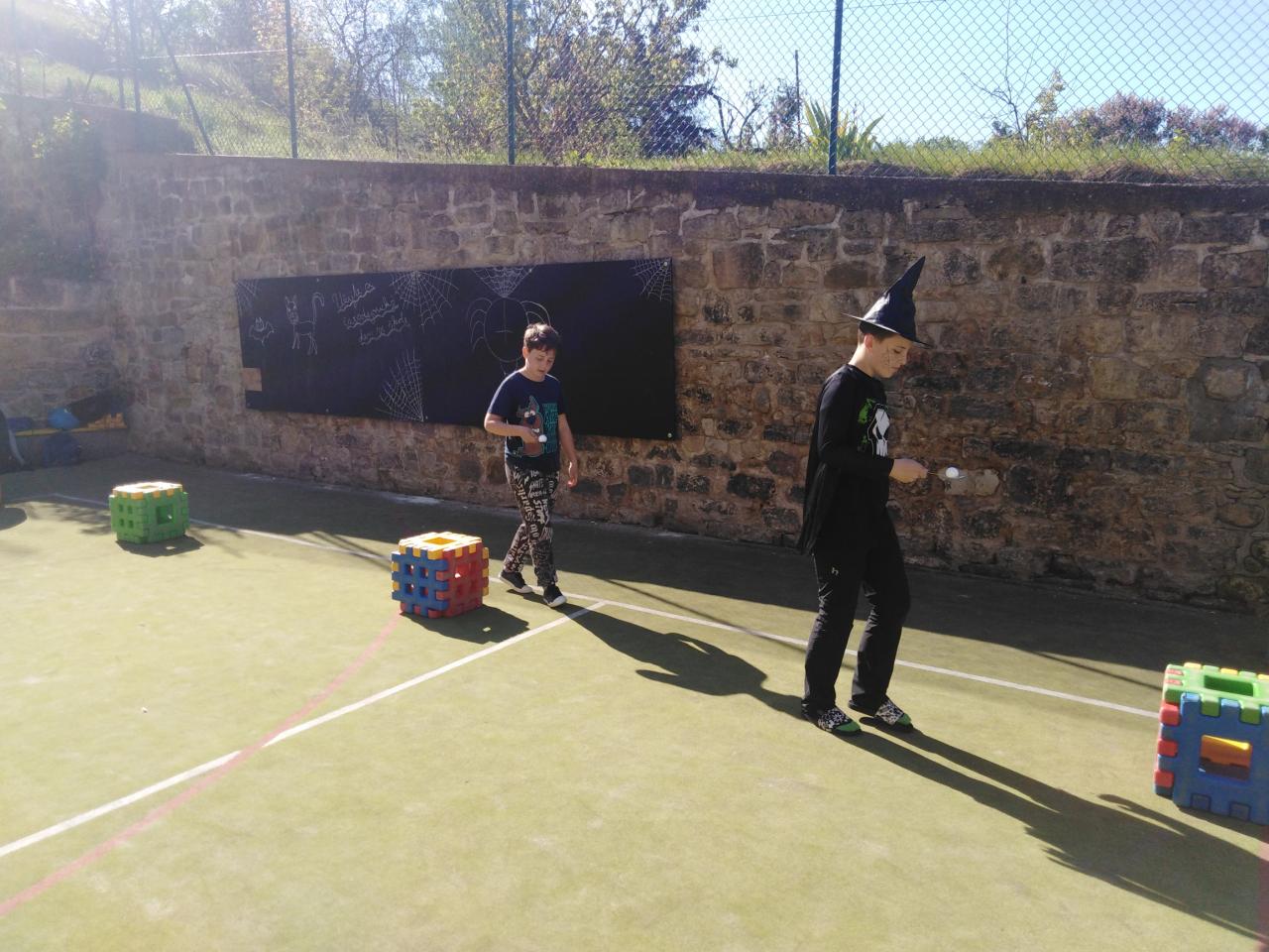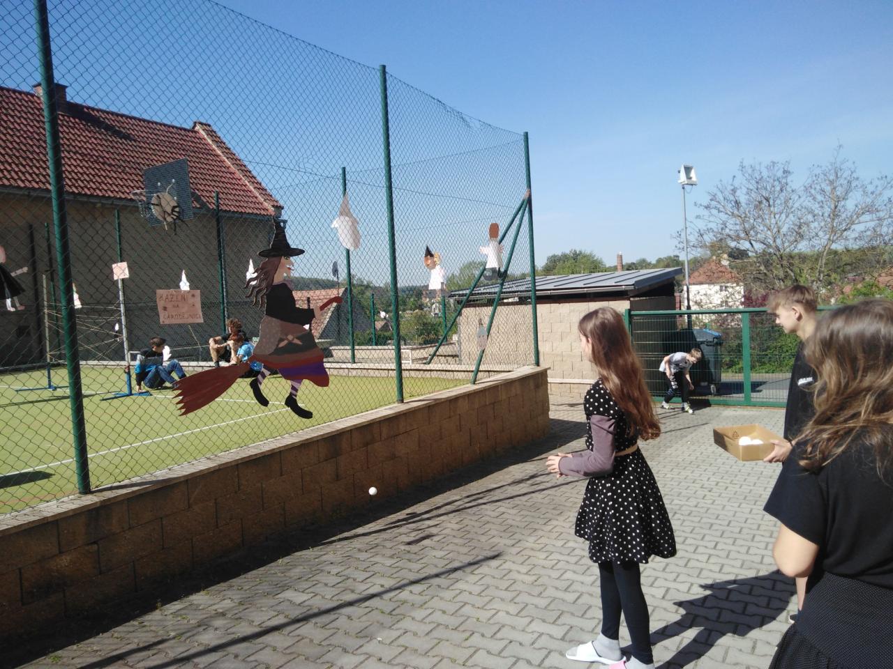 Následující dvě hodiny žáci procházeli školou, kde na jednotlivých zastaveních plnili různé úkoly - létaní na koštěti, proplétání se mezi pavučinami, hledání švábů a pavouků ve sklenicích s žabím hlenem atd.