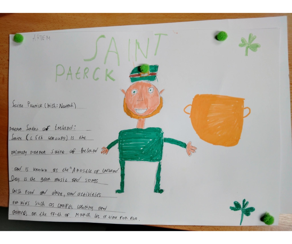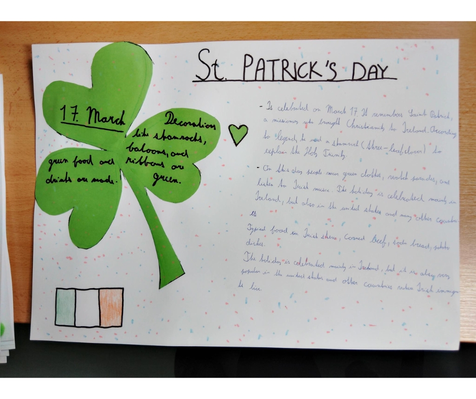 Žáci 7. třídy se zapojili do tvořivé aktivity na téma Den svatého Patrika, který se slaví tento týden. Během práce využívali anglické texty, vyhledávali informace. Výsledkem byly barevné plakáty, na kterých nechyběly typické symboly jako trojlístky, skřítci nebo hrnce se zlatem.